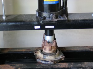 Remove the pinion nut. You will need a 1.5" socket to do so. Here, I am using an impact wrench on the pinion nut and, to prevent the yoke turning, a pipe wrench with a large extension on the handle so that it contacts the floor. |