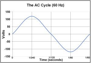 60Hz AC power means that the electrical current supplied to your house or shop regularly and gradually alternates from 0 volts to positive 120v back through 0v, down to negative 120v and then back to 0v again. It does this in a regular smooth cycle called a Sine wave, seen in Figure 2. In the case of 60Hz power, the current goes through this cycle 60 times every second – Hertz (Hz) is the unit for 1 cycle per second. Note that the voltage will be at maximum value twice during each cycle – once at (+)120v and once at (-)120v – in other words there will be max voltage 120 times per second for 60Hz AC power. |