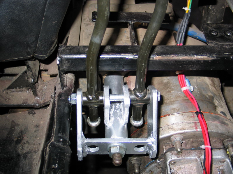 Then, by installing a long bolt through the bushings in the shift lever and through the holes in the tabs on the modified extension tube and extension tube bracket I have a sturdy pivot for the shift levers.