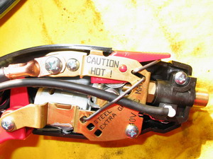 The cold switch is contained in a 3" x 5" box that is integrated into the Ready Welder's power cable, near the quick-disconects. The box contains a solenoid system that is operated by the gun trigger. Releasing the gun trigger deactivates the solenoid, disconnecting power from the welding gun. As a result, the end of the gun is only "live" when the trigger is pulled, much the same as any MIG machine.