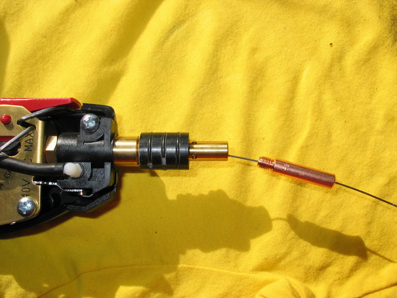 Slide the gas diffuser over the wire and screw it into the end of the gun. |