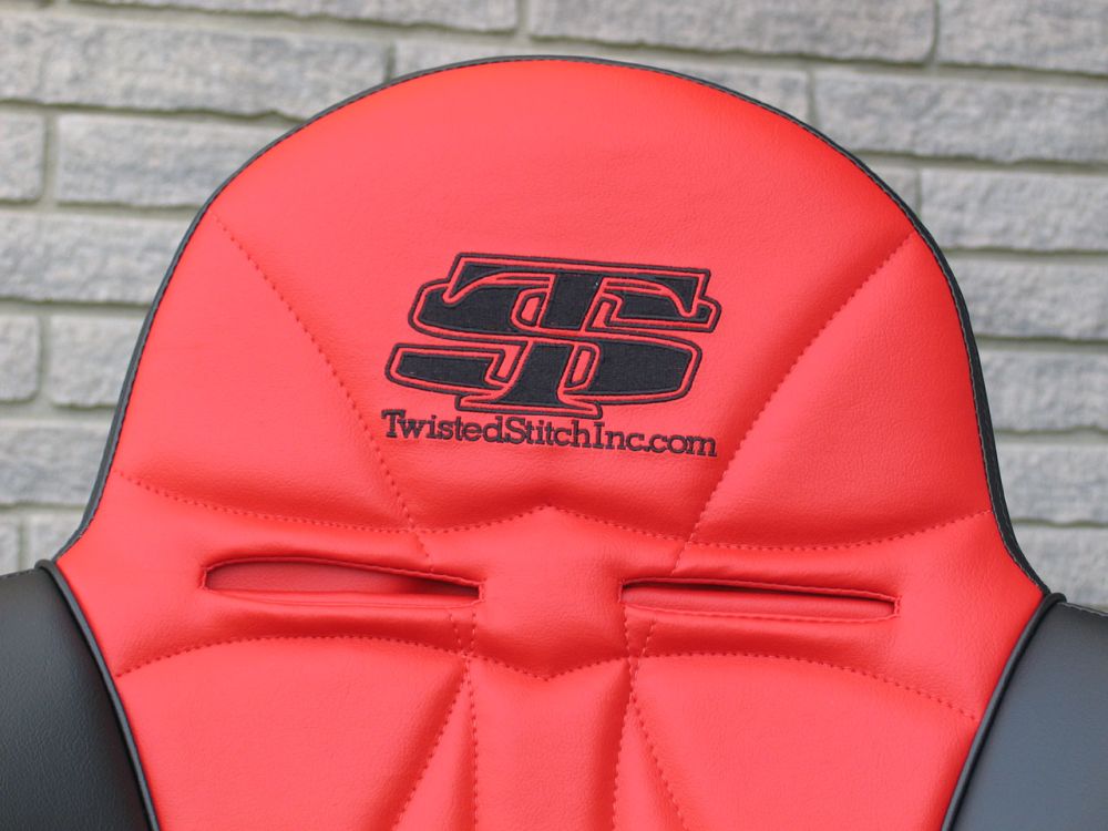 Fixed headrest, shoulder-belt slots, and the Twisted Stitch logo embroidered into the seat. |