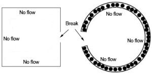 Any break in the circuit's continuity, anywhere, regardless of the location of the break will prevent electrons from flowing through it. This can be visualized by returning to the marble analogy. Imagine the "hula-hoop" which the marbles are contained in is cut and the cut ends are capped. Now, the hoop is full of marbles, but because the loop is not continuous, there can be no transfer of motion from one marble to the next as there is nowhere for the marbles to go - they are all just wedged in there. |