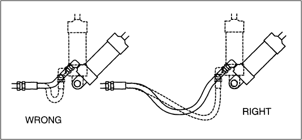 When there is relative motion between two parts joined by a hose, prevent twisting and distortion of hose by routing it in a gentle bend in same