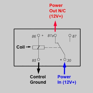In other words, when no voltage is applied to the relay coil, terminal 30 is connected to terminal 87a, and therefore high current 12V DC is available at terminal 87a, as shown in this schematic