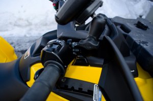 I love to explore on my ATV and can ride for hours and a hundred km or so on a given day, so GPS for navigation and scouting trails is essential to me. I've been using my Garmin Oregon 450 in different vehicles for a couple of years now, so mounting it securely was a must. The RAM Mount mount fits perfectly (and only just) beside the throttle housing / 4WD switch.