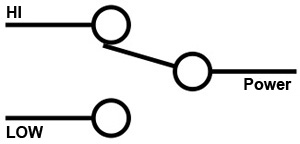 This is the schematic diagram for a single pole, double throw (SPDT) switch, This is also a simple and very common kind of switch. An example would be a selector switch where the user selects between two positions - a light switch with "HI" or "LOW" positions is an example. It controls a single circuit (so "single pole") and there are two switch position that can results in a circuit connection - the "HI" position or the "LOW" position - so "double throw").