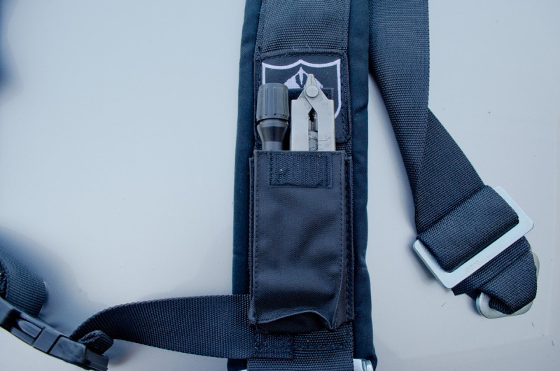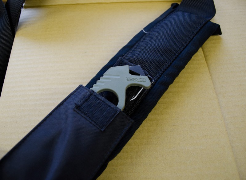 It too fits perfectly in the pocket, and right on the harness is a great place to keep it in case one was to ever get trapped and need to cut out in a hurry.
