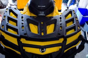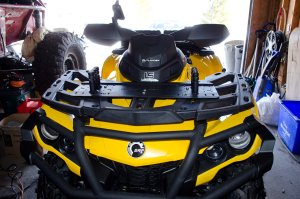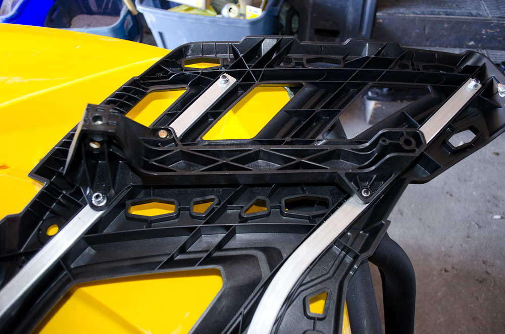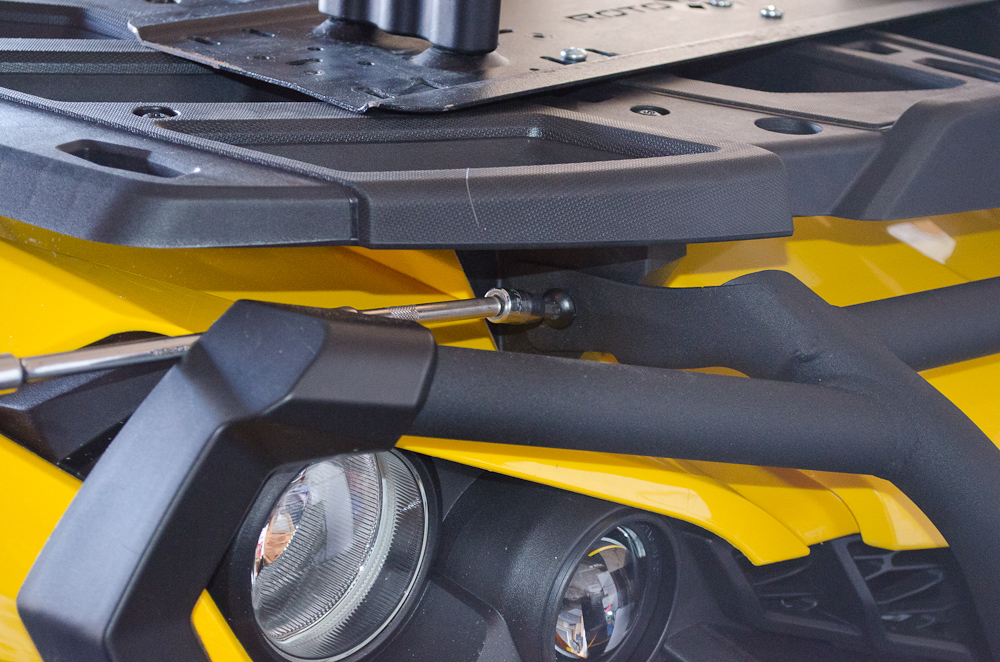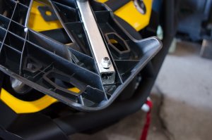 Next remove the two black bolts which are located on the front end of the ATV and join the rack to the front bumper.