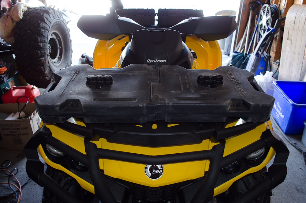 With the Rotopax mounting plate bolted to the front rack, all that is left is to re-install the front rack.