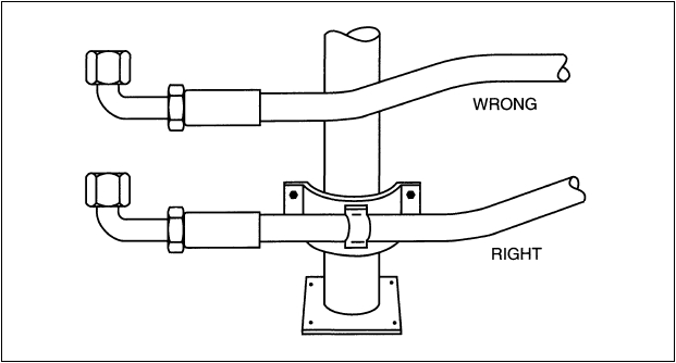 When determining the length of hose assemblies, provide sufficient length to prevent bending strain from localizing at the back