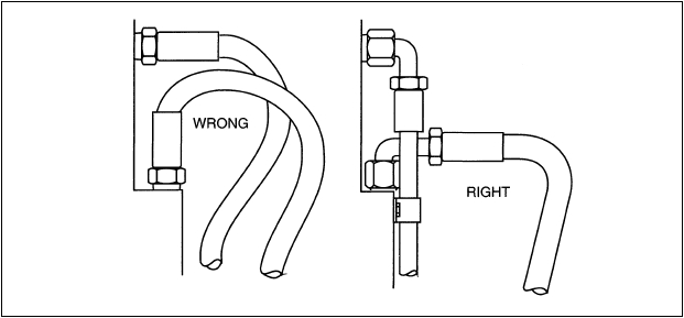 When there is relative motion between two parts joined by a hose, prevent twisting and distortion of hose by routing it in a gentle bend in same