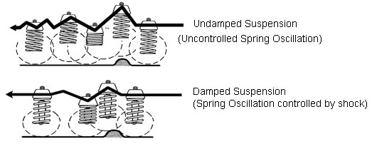 The rate at which the springs compress and rebound is called the suspension frequency. Left undamped, the spring will compress and rebound at the suspension's natural frequency until all of the energy originally put into the spring by the force of the bump is used. Of course, energy can neither be created nor destroyed; it can only be converted from one form to another. Unassisted, a spring will bounce up and down converting kinetic energy to potential and back again for a very long time. Obviously this would translate to terrible ride and handling, as the wheels would bounce up and down uncontrollably. |