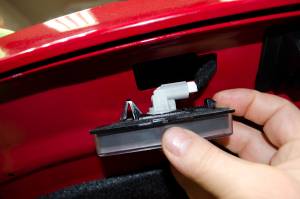 The license plate lights are located under the trunk lid, either side of the back-up camera and trunk-release button. |