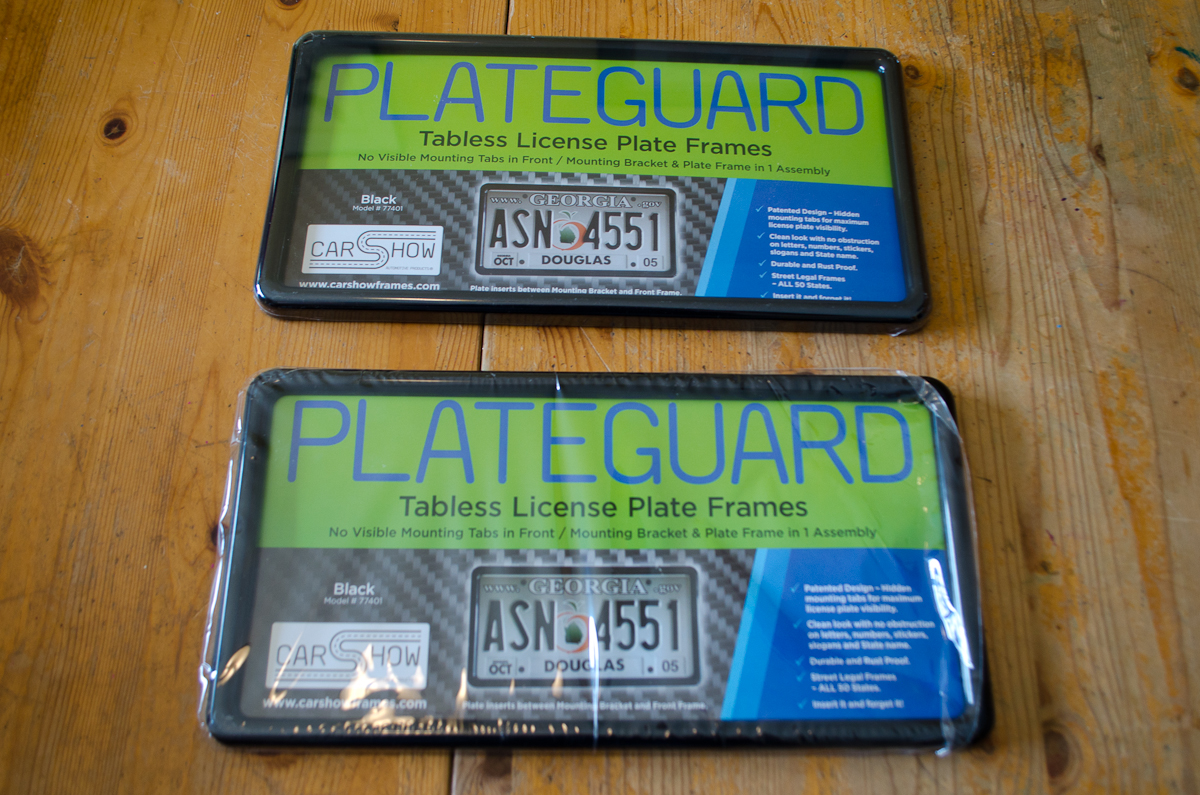 I researched a lot of different options, but eventually decided on the Carshow Automotive Products 77401 Plateguard, Tabless License Plate Frame and Holder/Bracket, Black.