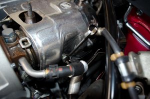 Fit the turbo blanket in place over the turbo, making sure it is well tucked in. Note how the stud for the turbo mounting bracket protrudes through the lower left hole.