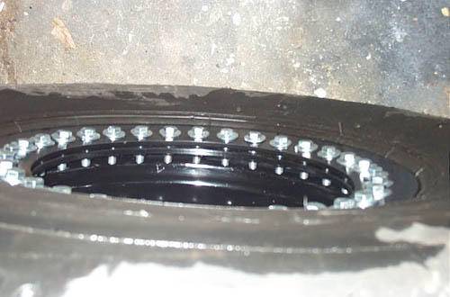 Anyone who reads Bill's story will see there is a lot in there about the coning of the outer ring. In order to prevent this, I put in a fan belt inside of the bolts to help prevent it. I used a 17405 fan belt, which I believe means it was 17 (mm?) wide, and 40.5 inches long. It fits perfect, and although it does not resolve the coning issue completely, I believe it does relieve it greatly, as well as providing a barrier against debris getting into the bolts. I think it would solve the issue completely if the belt were wider, but I got the widest one I could and it was not wide enough for SX Swampers. For something with a normal sized bead, like a BFG or MTR, I think it would probably work fine.